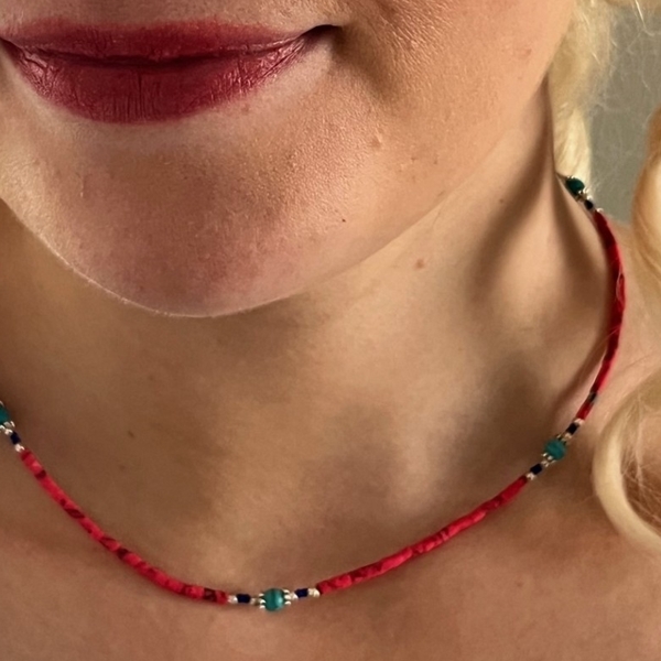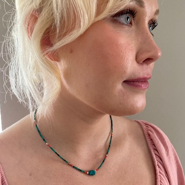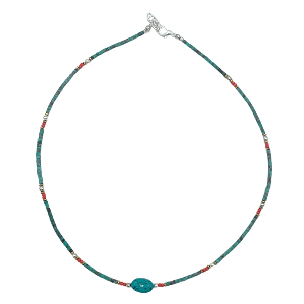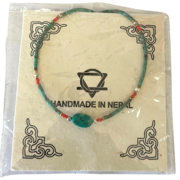 Handcrafted in Nepal, this delicate necklace showcases genuine turquoise beads accentuated by a larger turquoise stone, creating a harmonious interplay of color and texture. A timeless gemstone necklace that brings a touch of natural color and quiet elegance to any style.