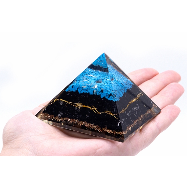 This striking Orgonite Pyramid has been handcrafted from a blend of high-quality resin combined with turquoise gemstones. black tourmaline, and metal filings, carefully layered into the classic pyramid shape.